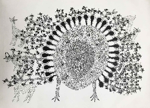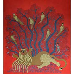 In her work, Japani Shyam attempts to bring to the forefront the different moods of animals, their struggle to sustain themselves and survive in changing environments. Born and brought up in the city, her perspective on Gond beliefs and ritual is slightly distanced and different from those of her parents.