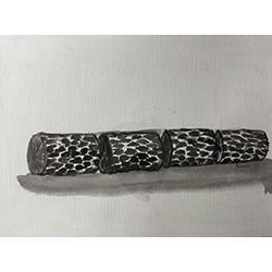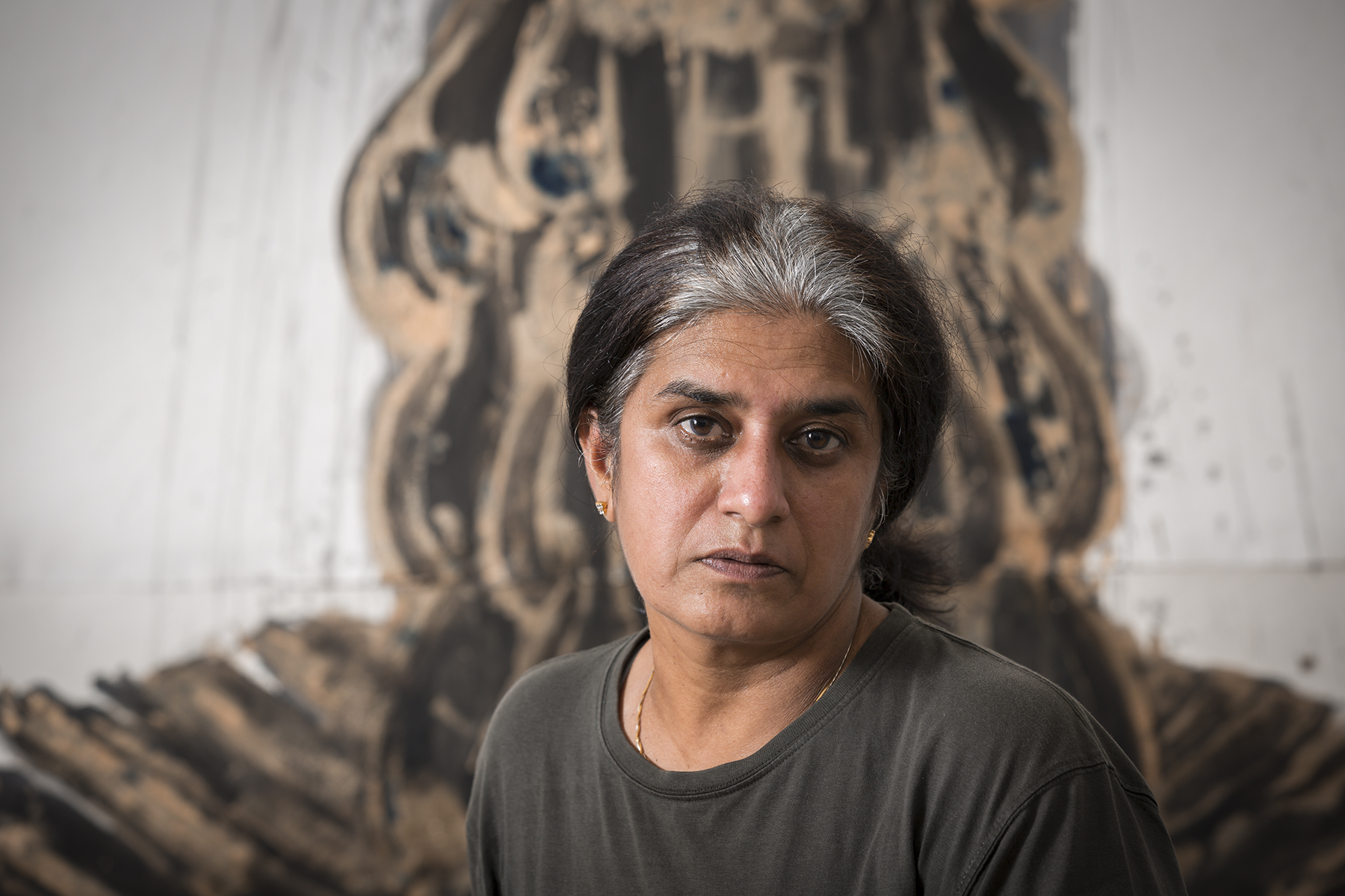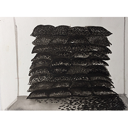 Shanthamani articulates the centrality of charcoal as material in some of her works. Charcoal best represents the transformation undergone by the city of Bengaluru, where new professionals talk of being ‘burnt-out’. Charcoal also expressed the city’s state of constant change, a permanent condition of ‘in-between’, since it is itself between wood and ash. The form of carbon that is most easily available to Shanthamani is wood charcoal. As a material, it is burnt, morbid but solid. It is also in a state of in-between: neither tree nor ash. Fragmented and fragile, yet like a phoenix rising from the ashes, it comes together for one last time to express itself in her work. Charcoal’s inherent capacity to express the polarity of life and death, mortality and immortality helps to deal with multifarious issues in her works.