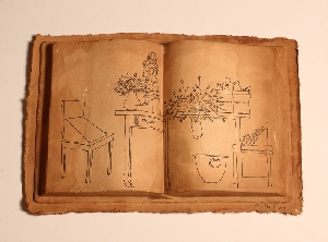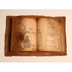 Carved AAC Block, wood, metal, glass, white cement, books covered in hemp, ritual fan