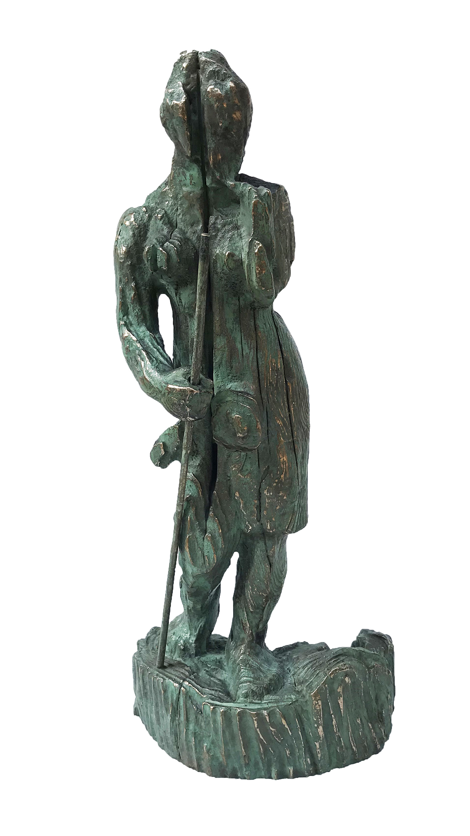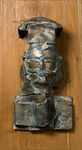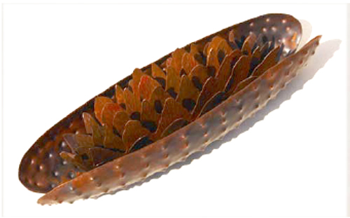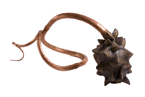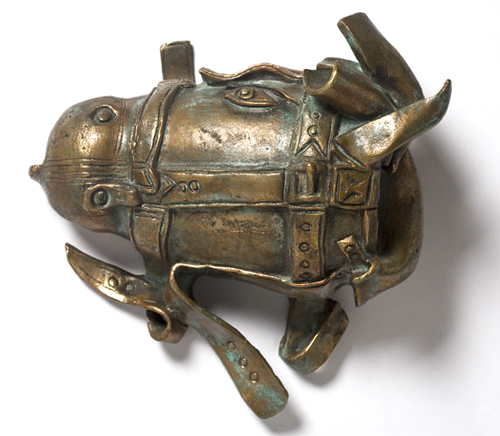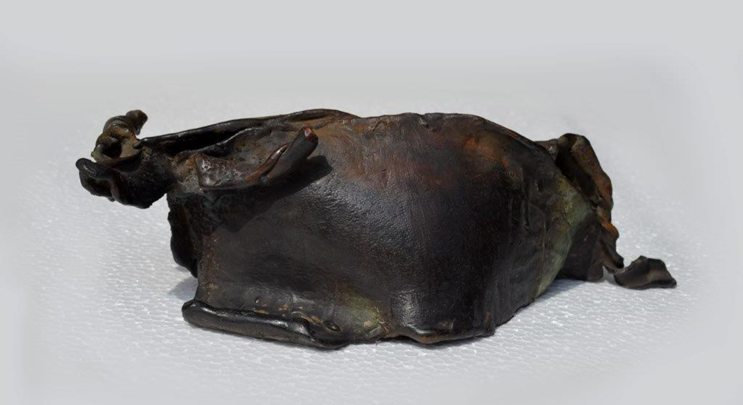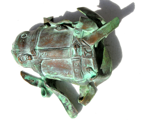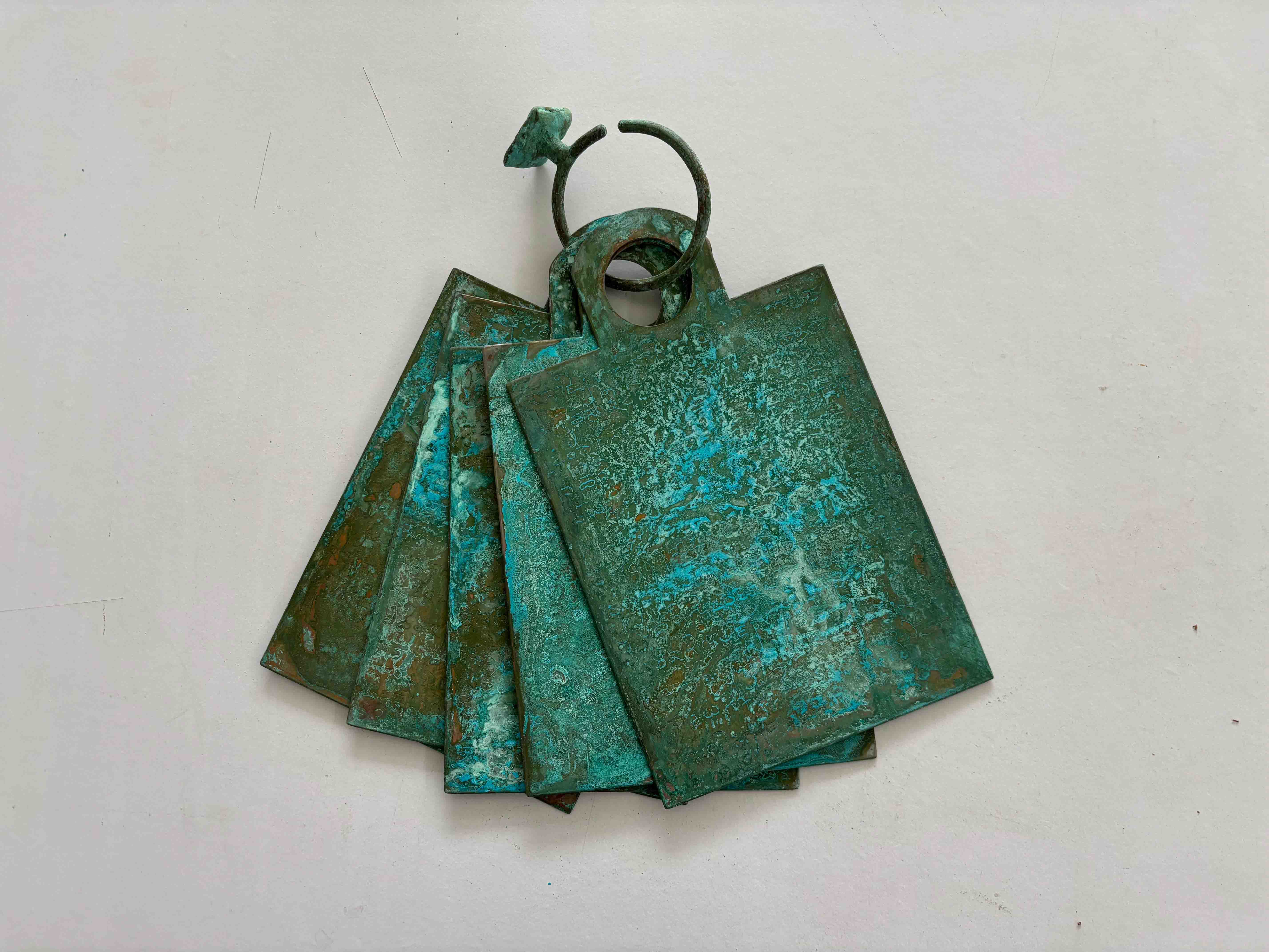 Copper with powder blue patina (script: Vengi 3c AD Pallava)