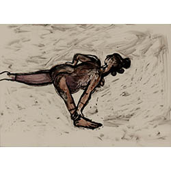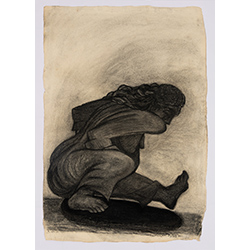 ‘Fallen warrior’, “Shattered’, ‘Antaheen’ - the series' titles add to the dark moods of these works. We see helpless migrants trudging along as if in a trance, and bodies desperately trying to maintain balance. We see fallen, defeated warriors, their armour now transformed into a burden rather than a shield of protection. There are wrecked bodies in convoluted positions, and mothers mourning a battered child. In the series of large works “Stuck in the shadow”, strange bodies are caught in moments where they are about to topple: almost falling out of their own shadows, only to be saved by their sense of balance.